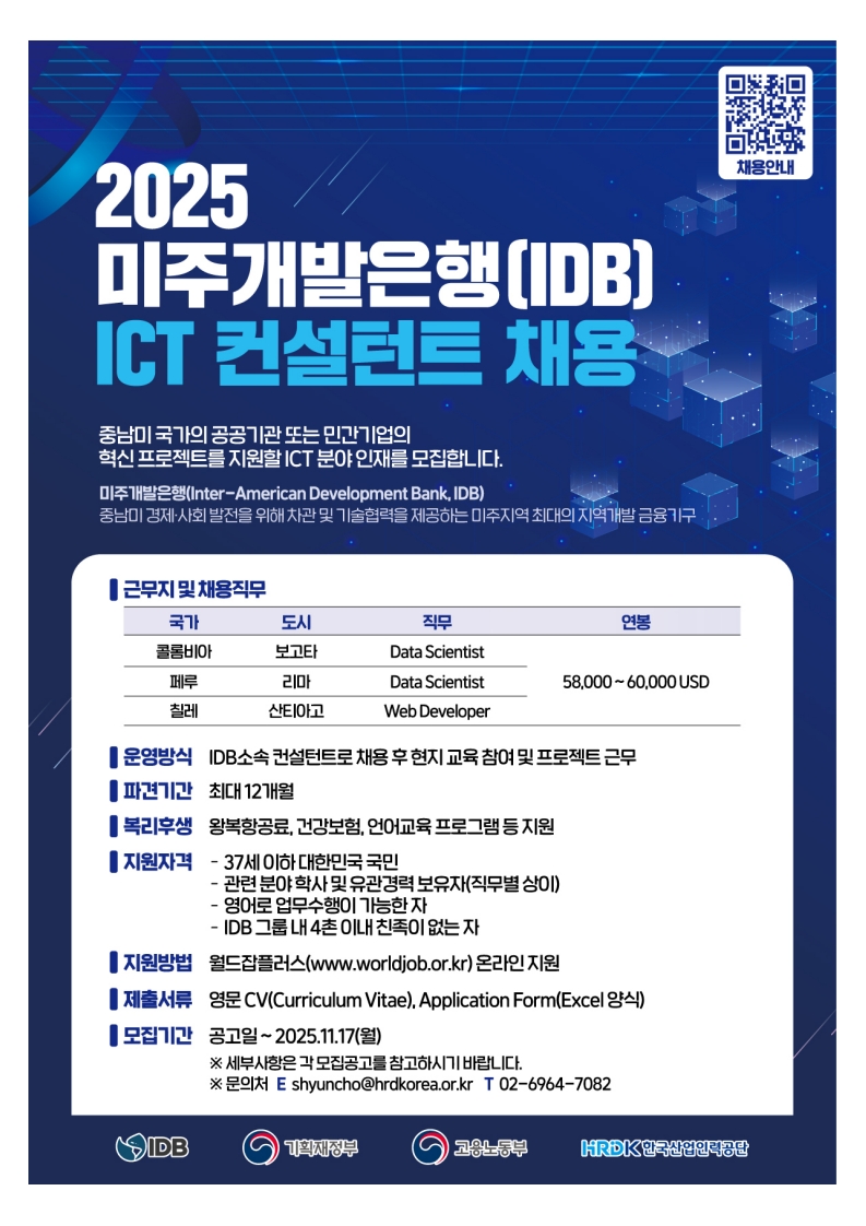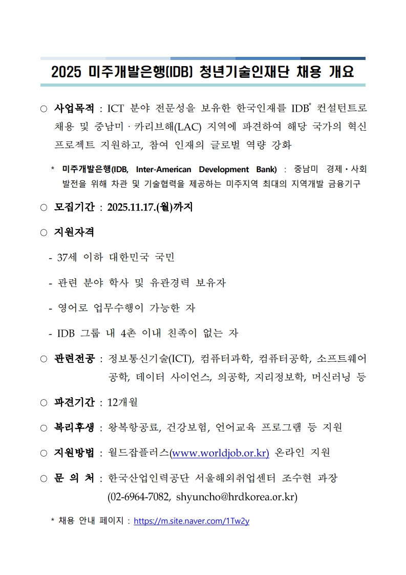 [대학일자리플러스센터] 미주개발은행(IDB) ICT 컨설턴트 채용 공고