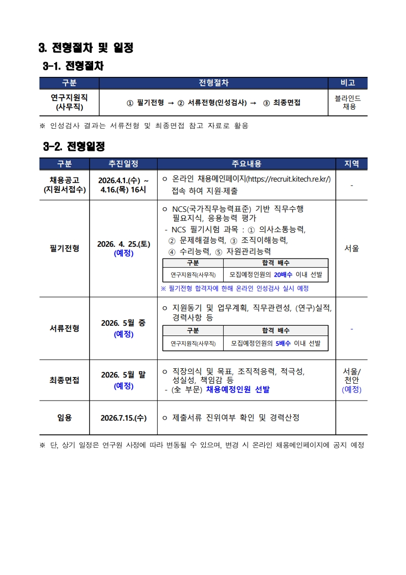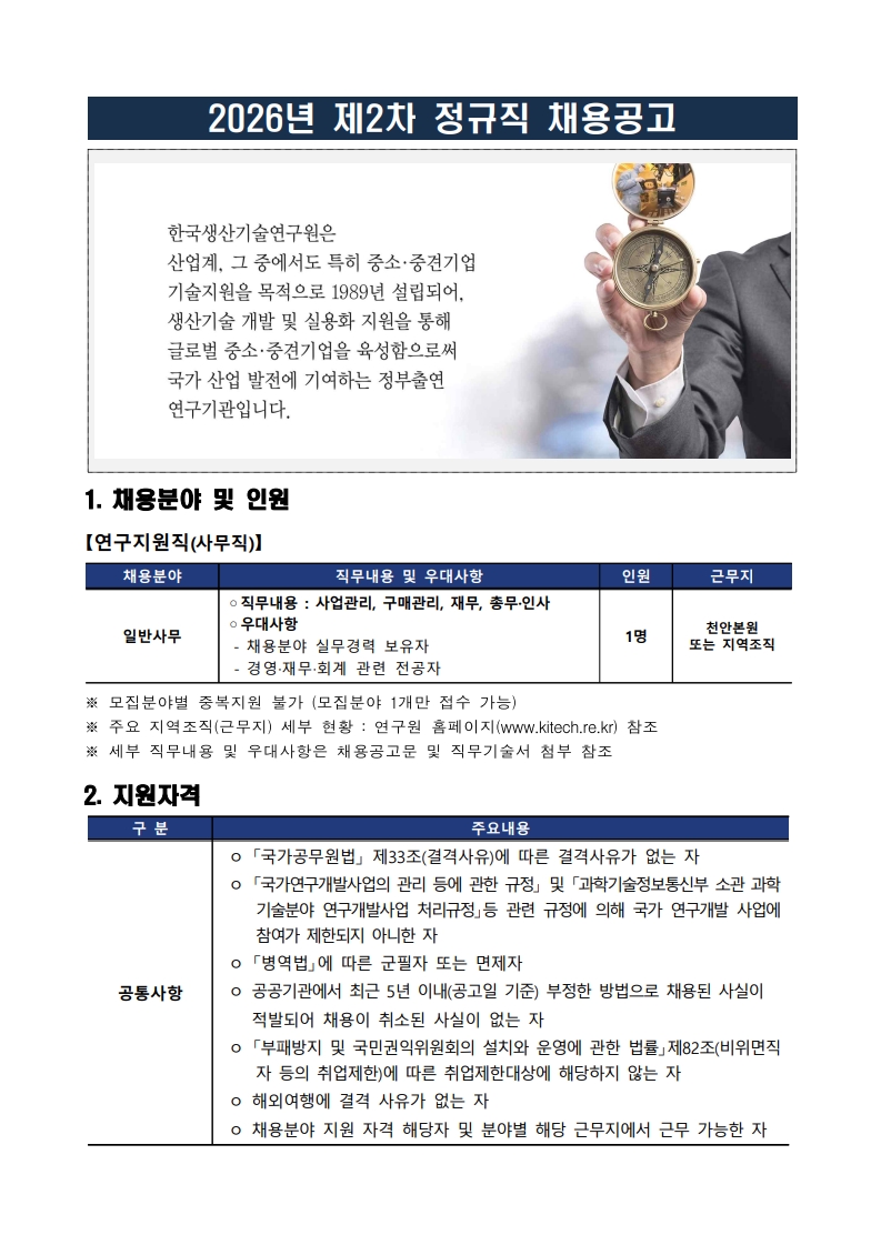 ※장학공지는 성신포탈 로그인 후 ‘공지→학부장학’에서 확인하세요. (대학원은 각 대학원 홈페이지에서 확인) fnctId=bbs,fnctNo=3183 [대학일자리플러스센터] 2026년 제2차 한국생산기술연구원 정규직(일반사무) 채용 공고 작성일 2026.04.17 수정일 2026.04.17 작성자 대학일자리플러스센터 조회수 56 글번호 154279 첨부파일 [붙임] 한국생산기술연구원 정규직(일반사무) 직무기술서.pdf 미리보기 [한국생산기술연구원] 2026년 제2차 정규직(일반사무) 채용 공고.pdf 미리보기