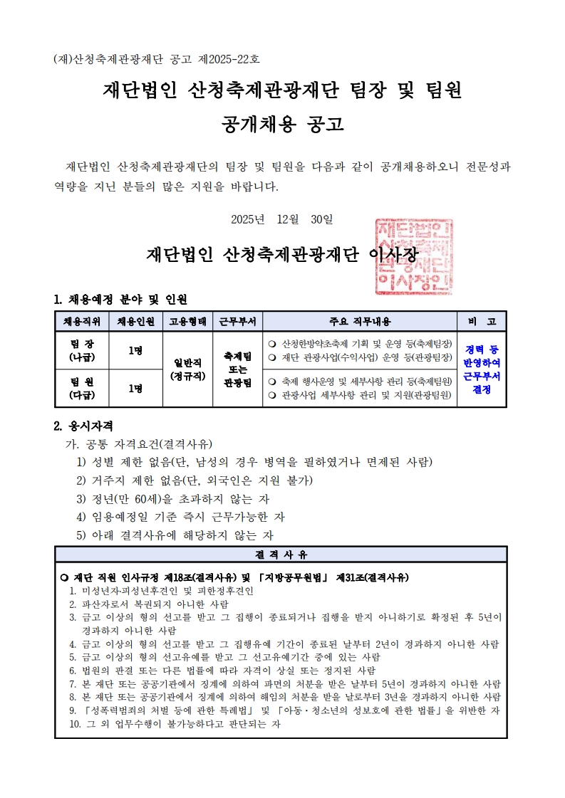 ※장학공지는 성신포탈 로그인 후 ‘공지→학부장학’에서 확인하세요. (대학원은 각 대학원 홈페이지에서 확인) fnctId=bbs,fnctNo=3183 [대학일자리플러스센터] 산청축제관광재단 직원 공개채용 공고 작성일 2026.01.02 수정일 2026.01.02 작성자 대학일자리플러스센터 조회수 164 글번호 150419 첨부파일 [산청축제관광재단] 응시자 지원서류.hwp 미리보기