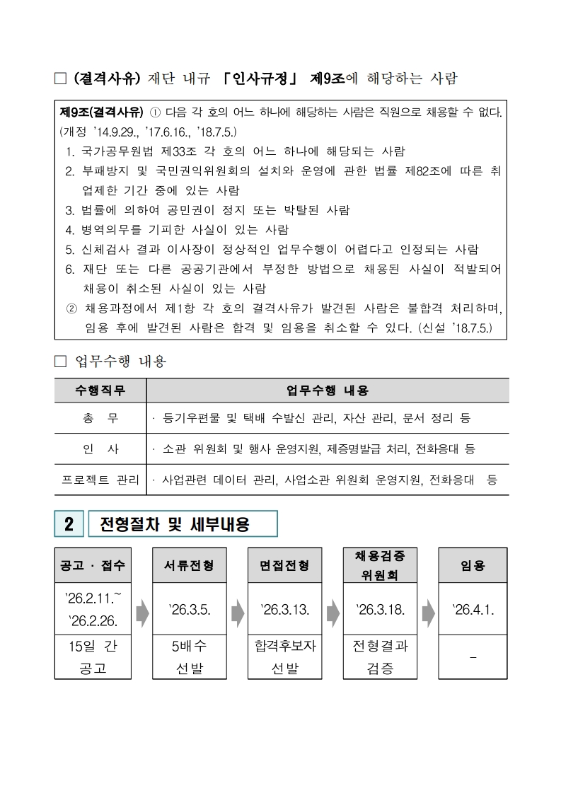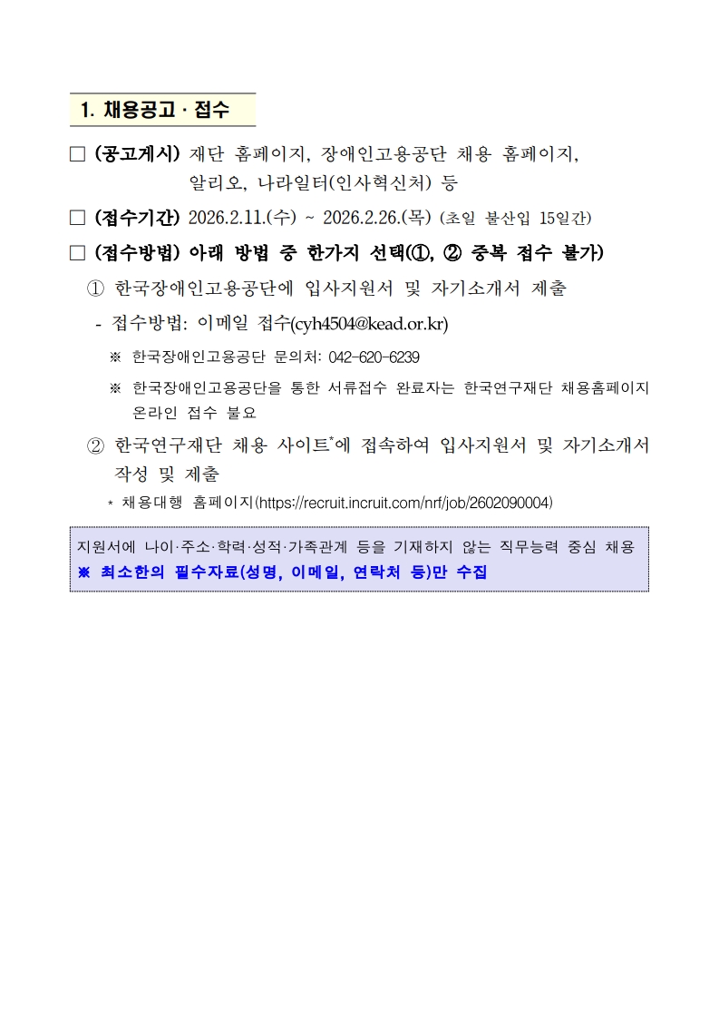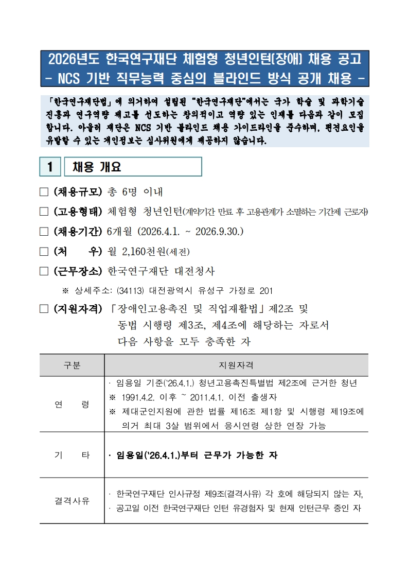 ※장학공지는 성신포탈 로그인 후 ‘공지→학부장학’에서 확인하세요. (대학원은 각 대학원 홈페이지에서 확인) fnctId=bbs,fnctNo=3183 [대학일자리플러스센터] 한국연구재단 2026년도 체험형 청년인턴(장애) 채용 공고 작성일 2026.02.12 수정일 2026.02.12 작성자 대학일자리플러스센터 조회수 81 글번호 151732 첨부파일 [한국연구재단] 2026년도 체험형 청년인턴(장애) 채용 공고.pdf 미리보기 [붙임1] 한국연구재단 청년인턴(장애) 입사지원서 양식.hwp 미리보기 [붙임2] 한국연구재단 청년인턴(장애) 직무기술서.pdf 미리보기 [붙임3] 한국연구재단 청년인턴(장애) 편의지원 신청 안내문.hwp 미리보기