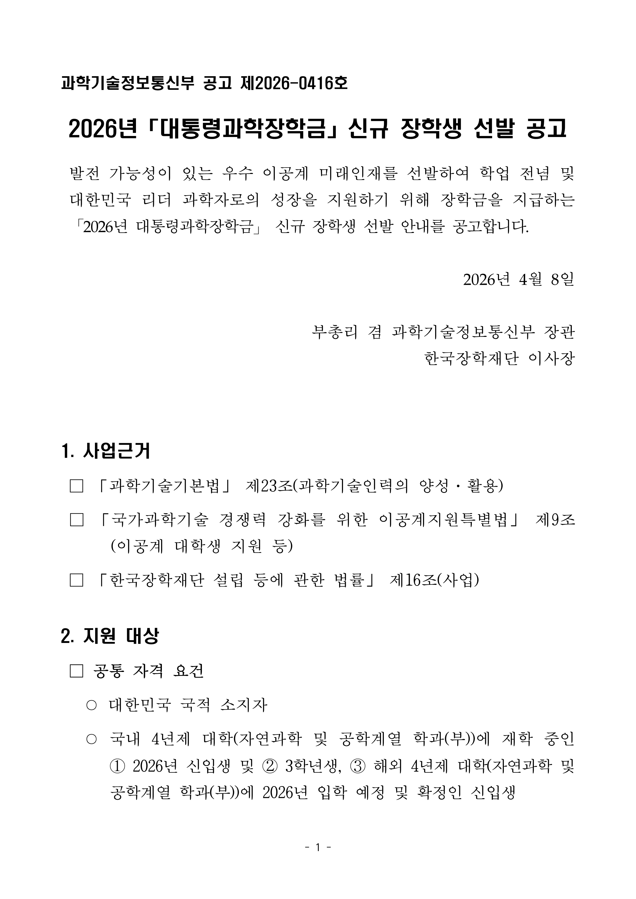 fnctId=bbs,fnctNo=4475 [교내 공지] [학생지원팀] 국가우수장학-2026년 대통령과학장학금 신규장학생 선발 작성일 2026.04.09 수정일 2026.04.09 작성자 수리통계데이터사이언스학부 조회수 5 글번호 154032 첨부파일 1._2026년_대통령과학장학금_신규_장학생_선발_공고.pdf 미리보기 3._2026년_대통령과학장학금_제출서류_양식_압축.Zip