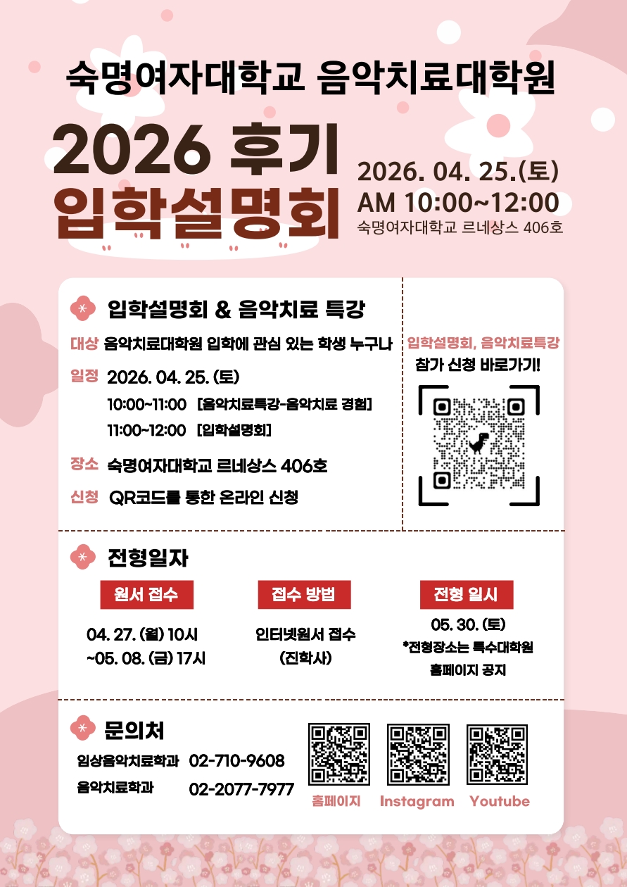 2026학년도 후기 숙명여자대학교 음악치료대학원 신입생 모집 안내