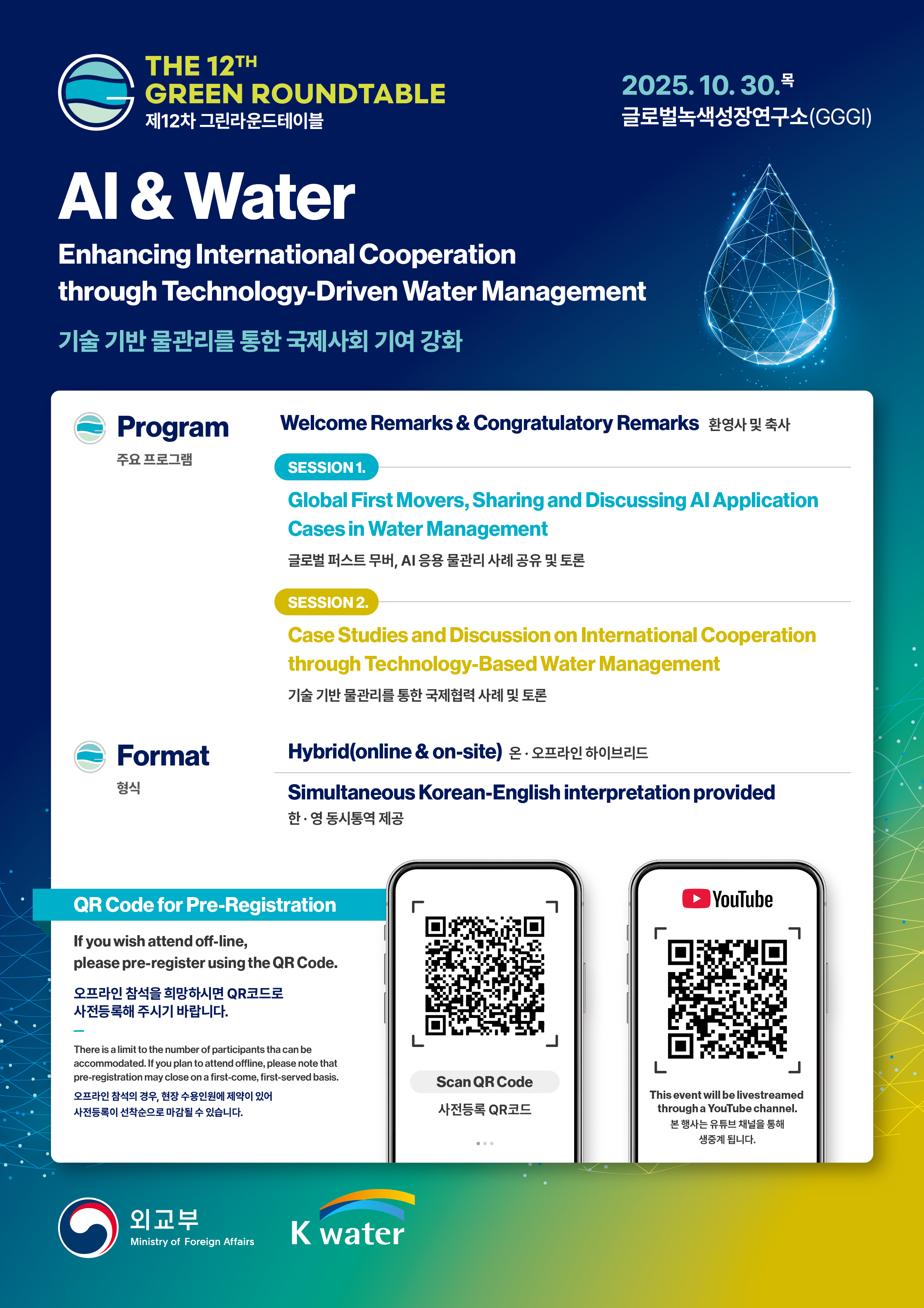 금번 제12차 그린라운드테이블의 주제는 “AI와 물 : 기술 기반 물관리를 통한 국제사회 기여 강화"입니다. 세션 1은 대한민국이 개발, 적용해 온 AI 기반 물관리 기술과 적용사례를 공유하고,
