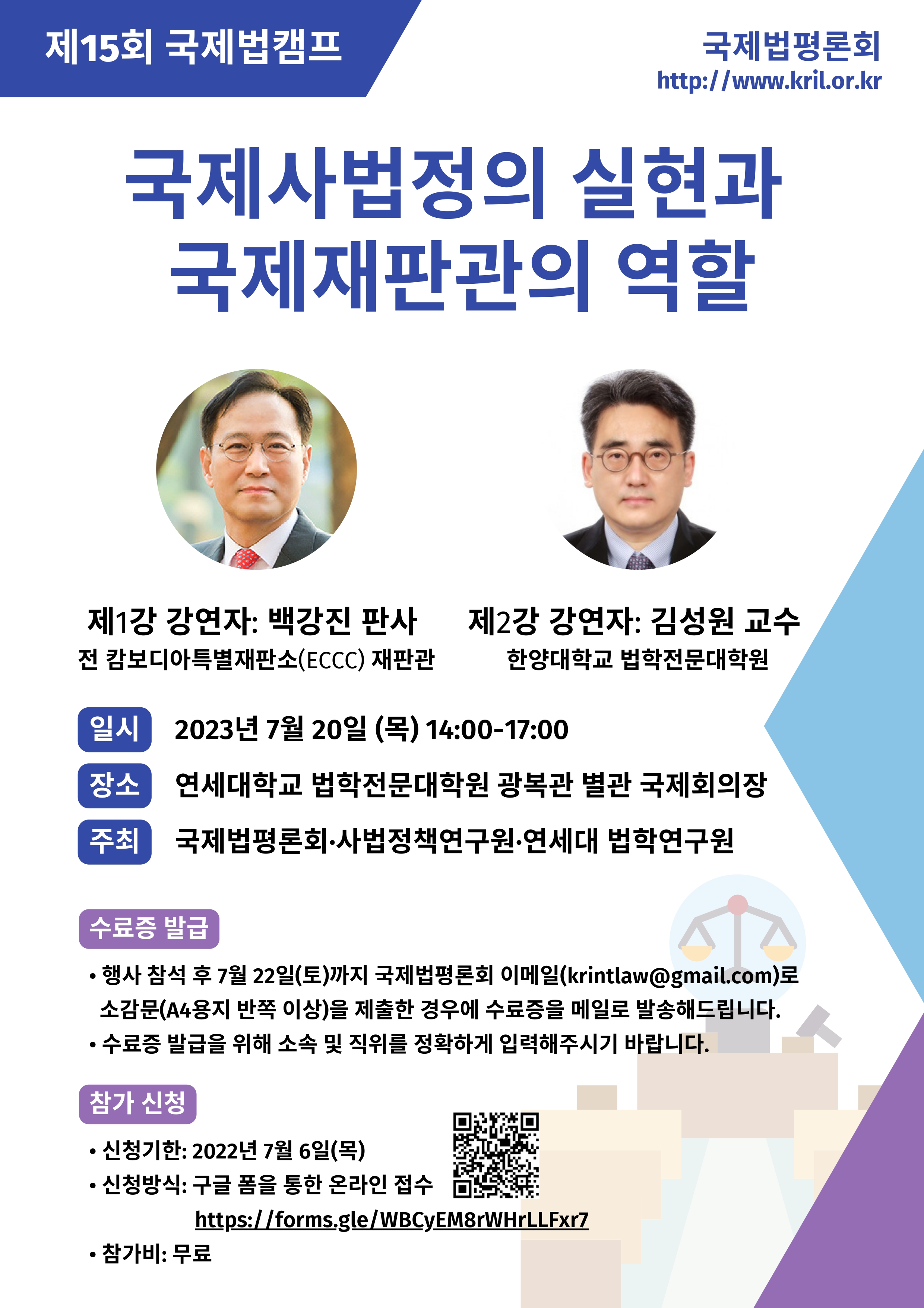 fnctId=bbs,fnctNo=4539 [국제법평론회] 제15회 「국제법캠프」개최 및 참가 신청 홍보 작성일 2023.06.07 수정일 2023.06.07 작성자 법학과 조회수 76 글번호 120879 첨부파일 첨부파일이(가) 없습니다. • 신청기한: 2022년 7월 6일(목) • 신청방식: 구글 폼을 통한 온라인 접수 https://forms.gle/H1wTpvhdKWpv5J7c8 • 참가비: 무료