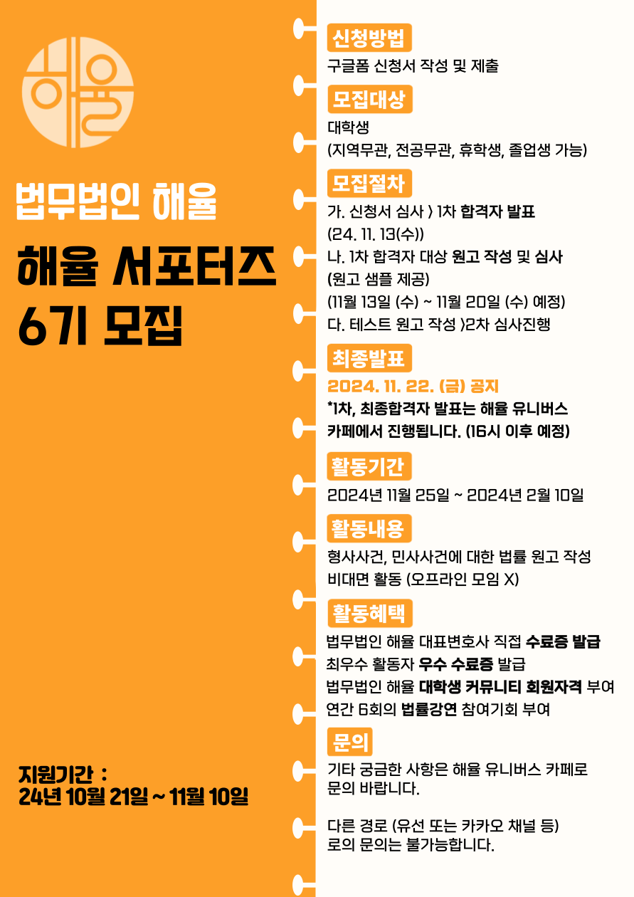 fnctId=bbs,fnctNo=4539 [법무법인 해율] 법무법인 해율 서포터즈 6기 모집 작성일 2024.10.28 수정일 2024.10.28 작성자 법학과 조회수 281 글번호 136521 첨부파일 법무법인 해율 서포터즈 6기 모집.hwp 미리보기