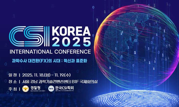 오는 11월 18일~19일, 경찰청과 한국 CSI학회에서「과학수사 대전환(FX)의 시대 : 혁신과 표준화」를 의제로「2025 제11회 국제 CSI 컨퍼런스」를 진행하오니 관심 있으신 분께서는 아래의 내용 참고 바랍니다. 단체로 참석하시고자 하는 경우(20명 이상) 아래의 단체등록양식에 필수 입력 항목 기재하시어 제2교학팀 메일(college2@sungshin.ac.kr)로 제출 바랍니다.